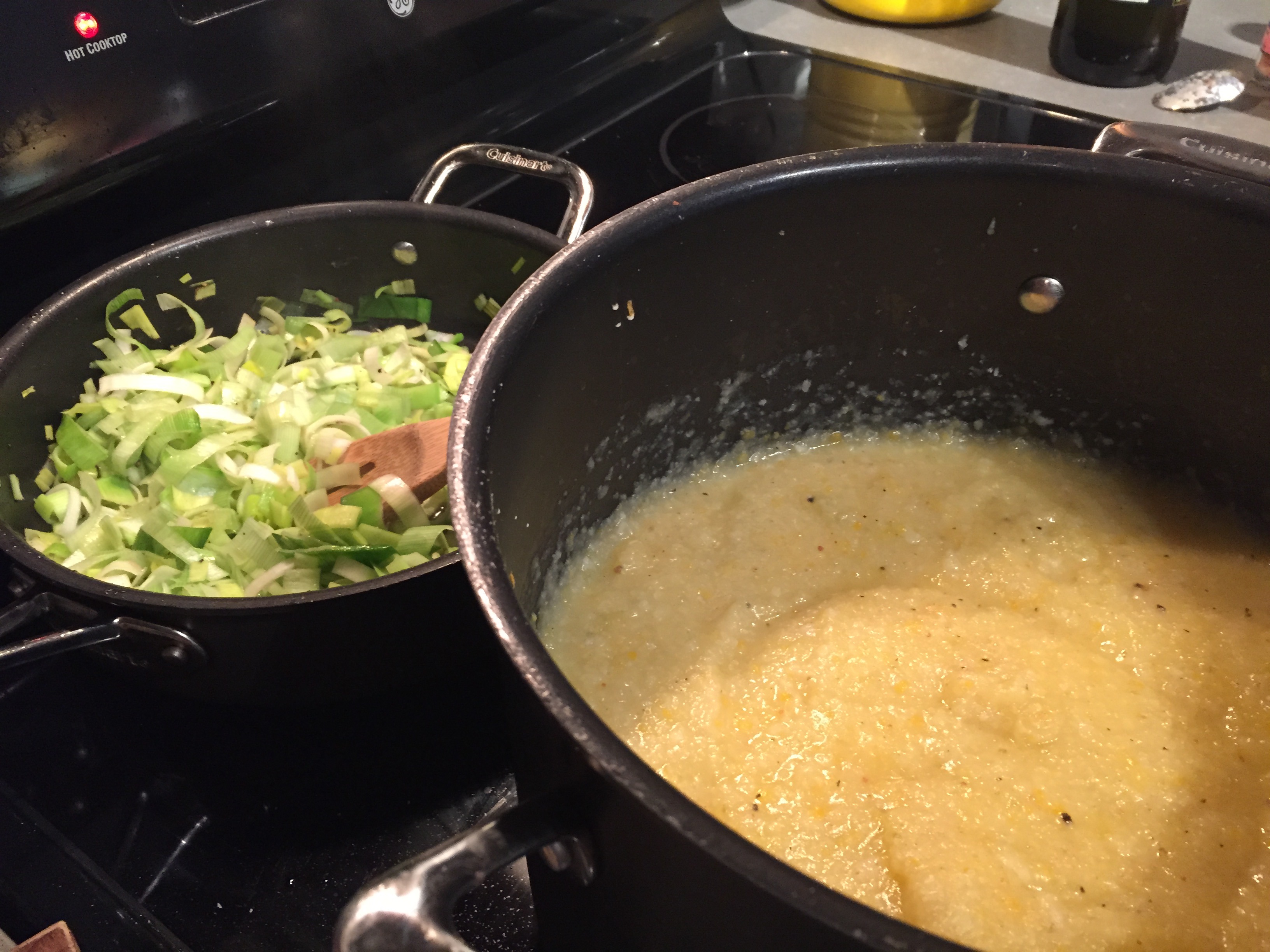 Leeks are really sandy so if you haven’t worked with them before I learned a trick from one of the million cooking shows I used to watch. Once you remove the dark green stalks from the leeks I slice them in quarters length wise. Then slice them in really thin slices width wise. Take a big bowl of warm water and break the leeks up and place them in the water. Move them around a little with your hands. The sand from the leeks will fall to the bottom of your bowl of water while the leeks float at the top. You can skim them off the top, place them in paper towels to dry and then cook them. After you soften them in the bacon grease you can add them into the pureed soup.