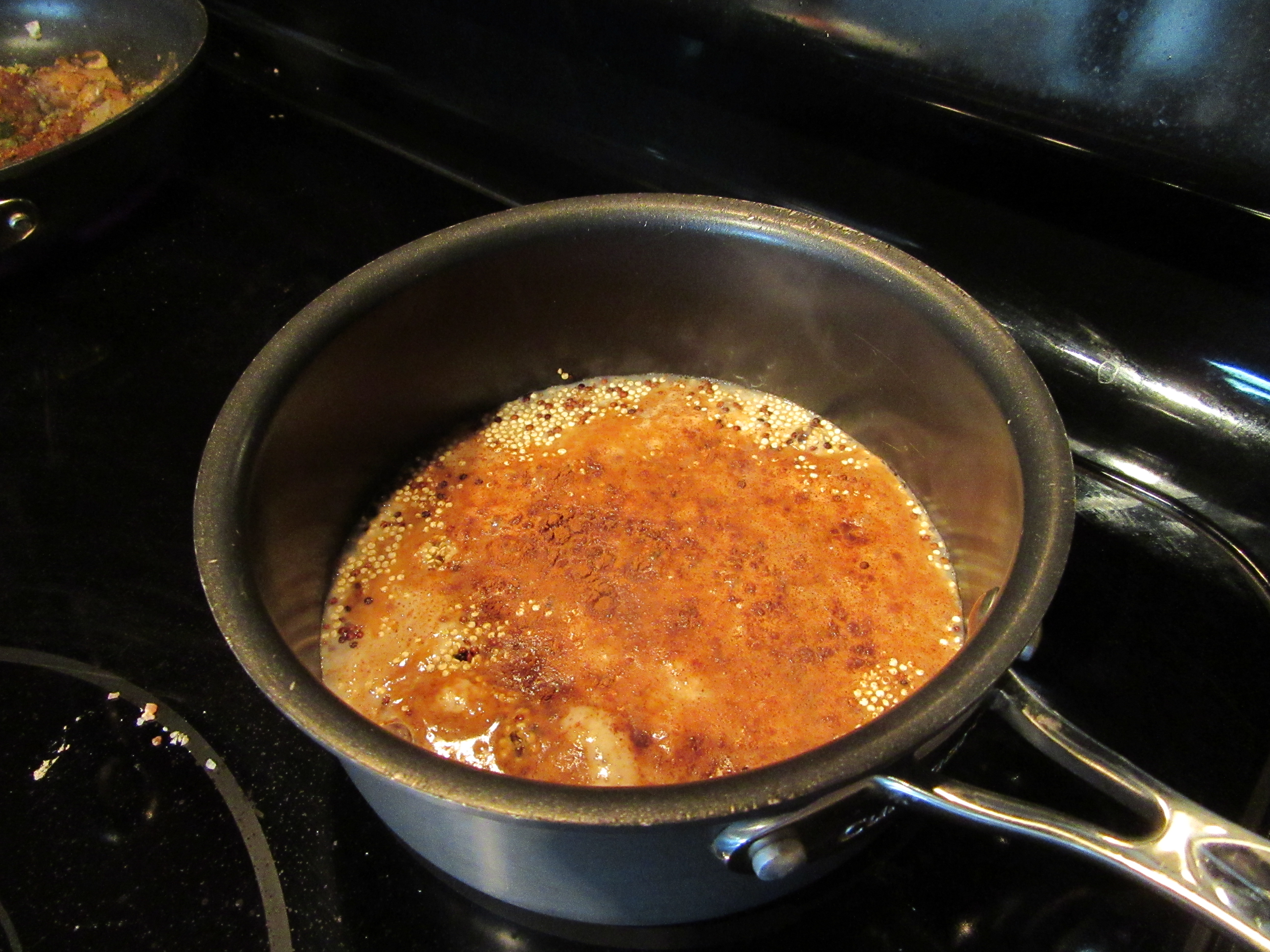 ***WARNING*** this dish is a messy one to cook. No matter what I do my milk ALWAYS boils over while I am cooking my quinoa. Once the milk and quinoa come up to a gentle boil and I put the lid on and turn the heat up the milk still bubbles up. This is definitely a dish you want to stand near the stove and watch the quinoa and when the milk starts to bubble up lift the lid of your pan so it goes back down and doesn’t boil over.